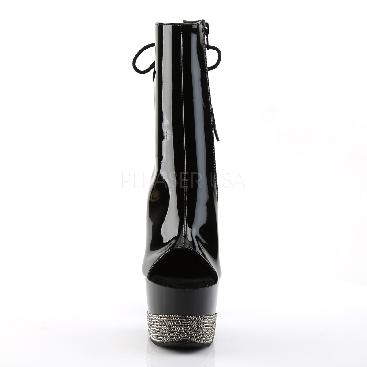 隠しファスナー ポケット特徴ラインス トーン覆われた下方のプラットフォーム、ジッパー閉鎖中でつま先/小剣かかとレースアップ バック足首ブートを開くスチレットヒール 7 インチ (17.8 cm)、2 3/4 インチ (7 cm) のプラットフォーム