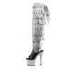 7 インチ (17.8 cm) ヒール、2 3/4 インチ (7 cm) プラットフォーム オープンつま先またはかかとバックレース アップ腿の高いブーツ 8 層クロムメッキを特色シミュレート ラインス トーン フリンジとラインス トーンがちりばめられたジッパー閉鎖中、全体のプラットフォーム