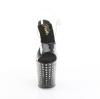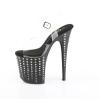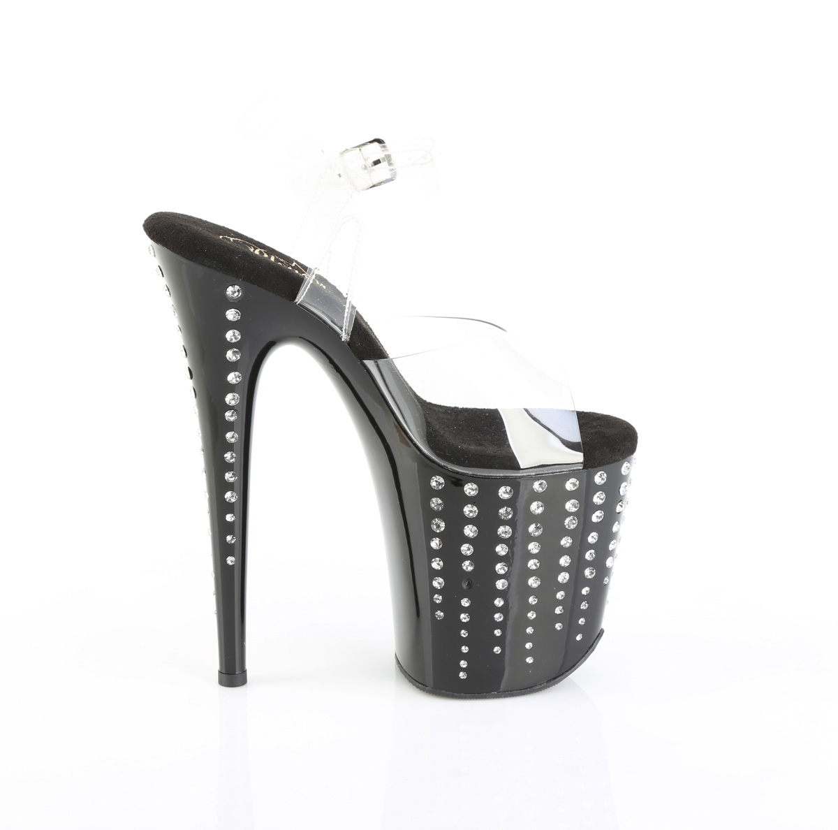 8インチ(100mm)ヒール、4インチ(200mm)プラットフォームアンクルストラップサンダル、プラットフォームボトムとヒールの外側にラインストーンティアドロップデザインが特徴