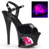 7 インチ (178 mm) かかと、2 3/4 インチ (70 mm) カットされたプラットフォーム アンクルス トラップ サンダル プラットフォームでブラック ライト反応の猫猫の特徴