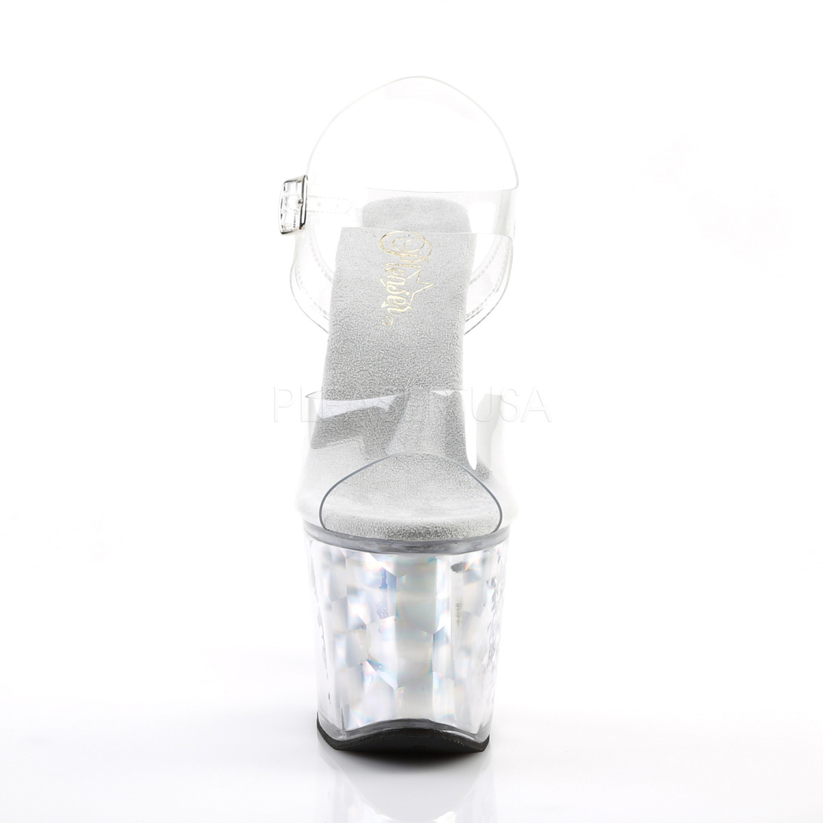 7 インチ (178 mm) かかと、3 1/4 (83 mm) プラットフォーム足首ストラップ サンダル特徴六角ホログラムかかと・ プラットフォーム底
