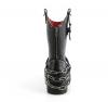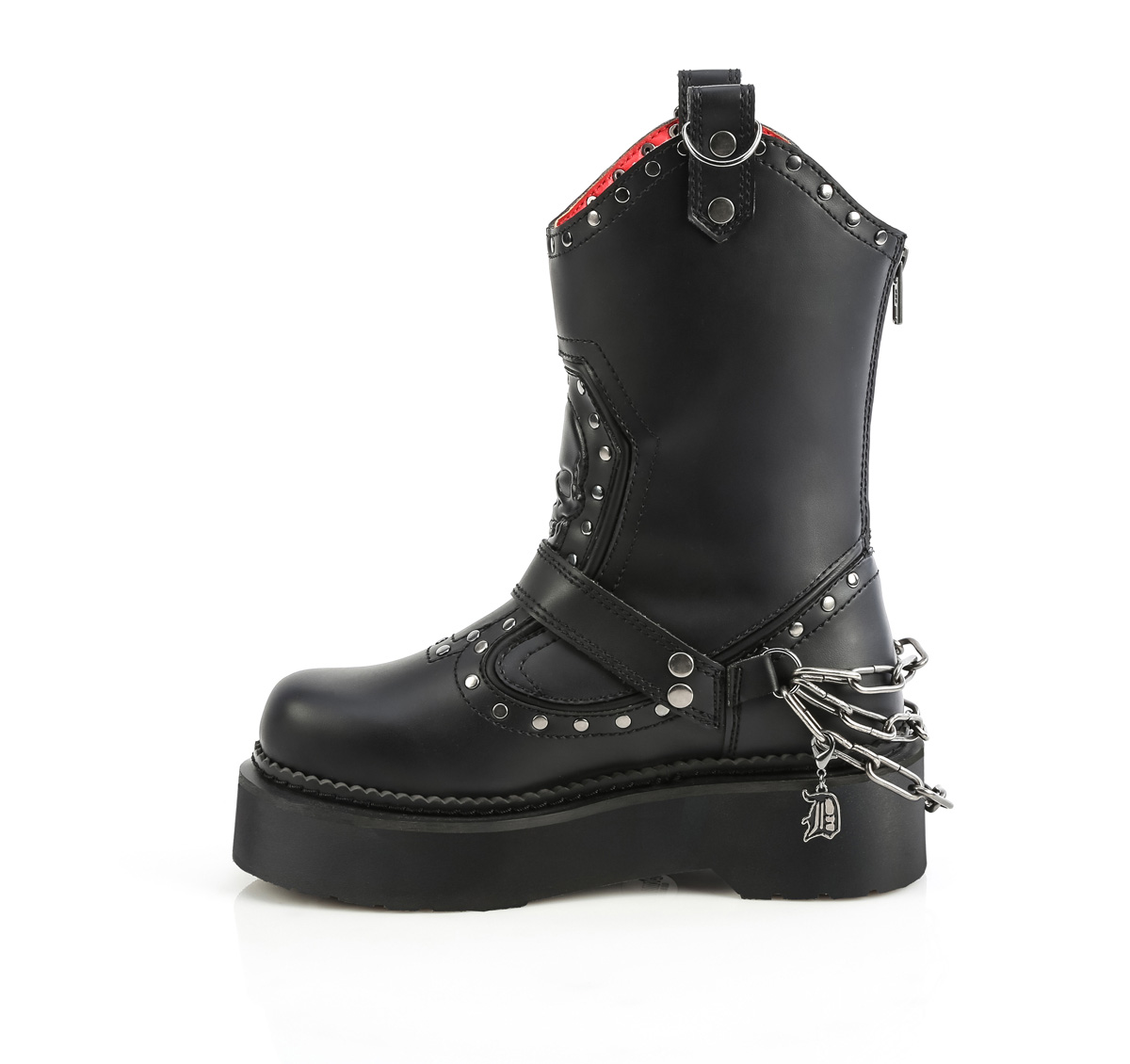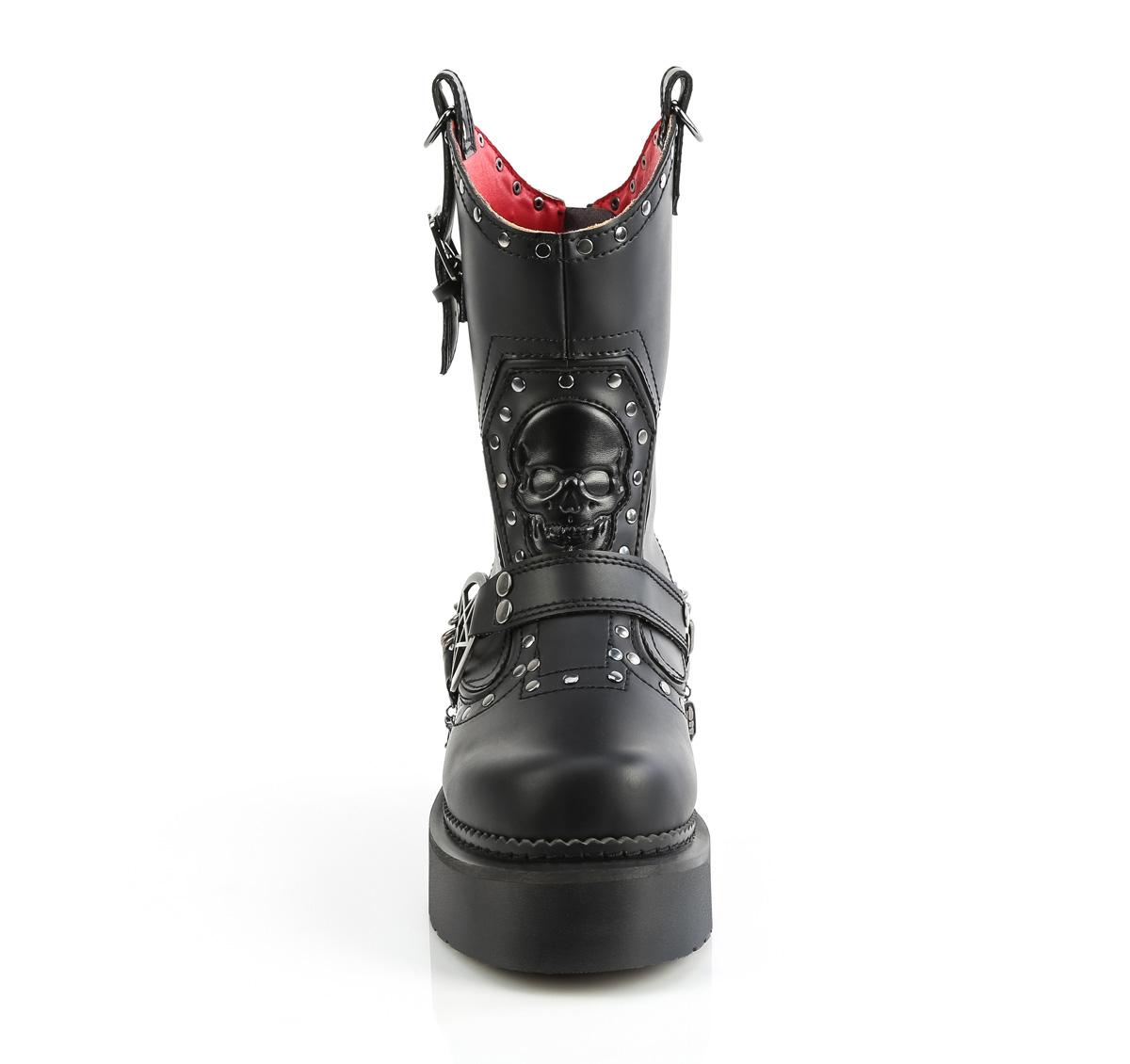 2インチ(51mm)積み重ねプラットフォームプルオンカウボーイスタイルのコンバットカーフブーツ、エンボス加工のドクロ、吊り下げチャイム付き五芒星ハーネス、金属製スタッズ装飾、背面メタルジップクローズ
