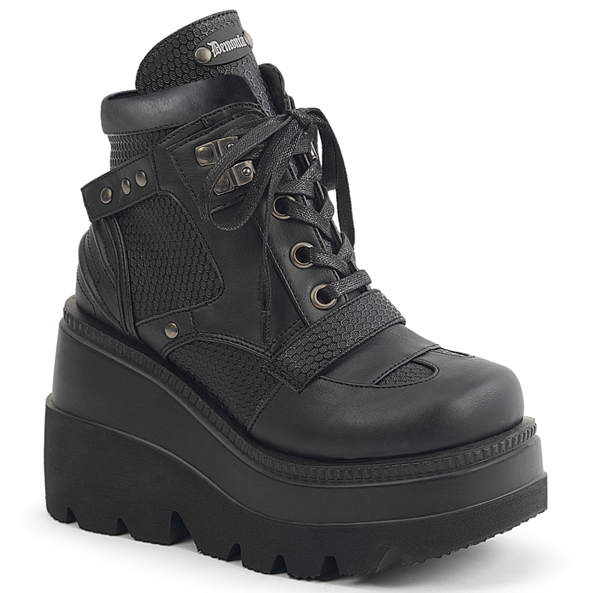 4 1/2インチ(114mm)ウェッジプラットフォームのレースアップフロントアンクルブーツ、曲線的なコントラストパネルデザイン、ヴァンプに丸いフラットスタッドのディテール、パッド入りカラー、タンに「Demonia」ブランドのラバーエンブレム