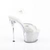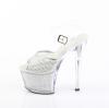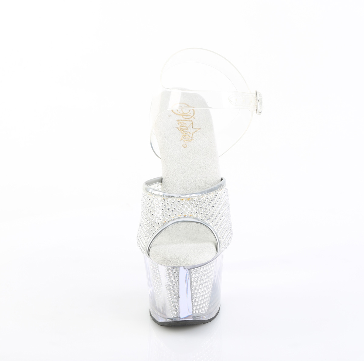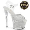 7インチ(178mm)ヒール、2 3/4インチ(70mm)プラットフォームアンクルストラップサンダル(丸みを帯びて滑らかなエッジ、透明で柔らかいTPUアッパー、シルバーラインストーンフィッシュネット生地オーバーレイ、シミュレートラインストーン充填プラットフォーム)。この「TPUプレミアム」スタイルには、交換可能な同色インソールとクリアなプラットフォームプロテクターが付属しています。